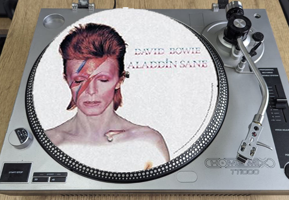 Add a flash of glam rock brilliance to your deck with this official David Bowie "Aladdin Sane" slipmat. Showcasing the iconic lightning bolt portrait from Bowie's 1973 album, this 12" slipmat is a bold tribute to one of music's most electrifying legends.