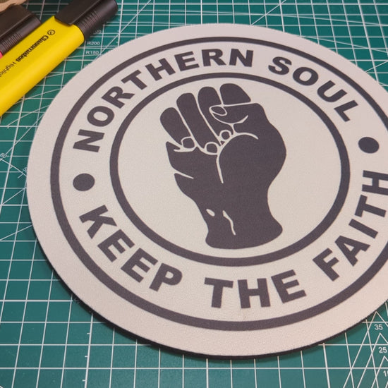-- FREE UK SHIPPING -- A circular mousepad ( mousemat ) featuring one of my most popular slipmat illustrations. Northern Soul - Keep the faith The design is the classic keep the faith logo of northern soul, in its purest form for the true oldskool. Its a clean black on white representation. Northern soul is a music and dance movement that emerged in Northern England and the Midlands in the early 1970s. It developed from the British mod scene, based on a particular style of Black American soul music with a heavy beat and fast tempo. This is a 100% Brand New and High Quality round mouse mat. The mousepad features 5mm thick Anti-slip Rubber Base so it stays firmly in place. It’s circular with a 20.2cm diameter. Stylish & fashionable design, adds a little personality and style to your Laptop of desktop PC set up. Made of a high quality smooth fabric, durable and beautiful. Light and comfortable, waterproof and breathable, soft to the touch so it feels good. (Please note the colours *may* differ slightly to real life based on the screen you're using)