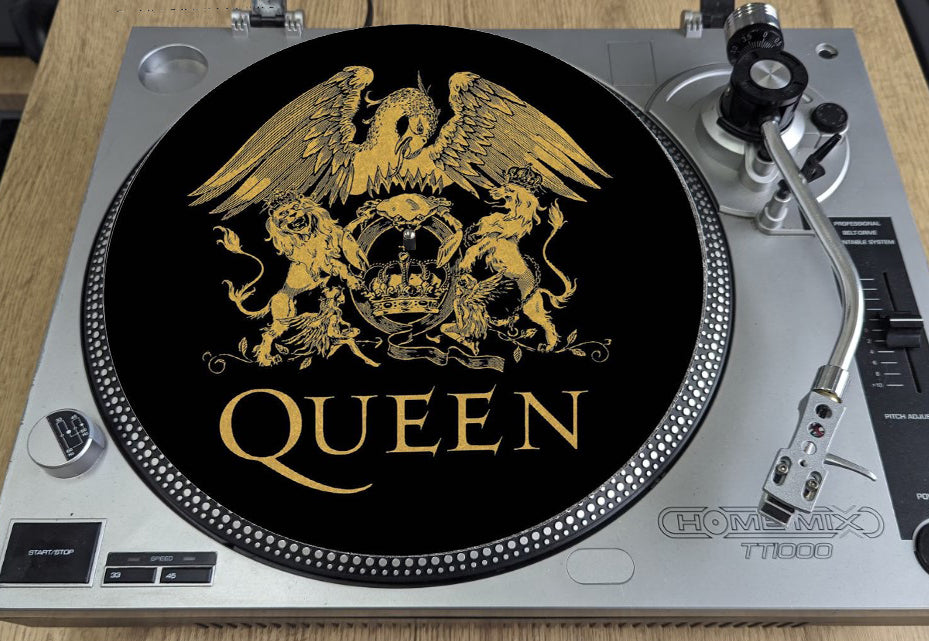 Bring a touch of rock royalty to your turntable with this official Queen Logo slipmat, featuring the band’s iconic gold crest set against a rich royal blue background. Designed by Freddie Mercury himself, the detailed emblem shines in bold metallic gold — a striking tribute to one of the greatest bands in music history.
