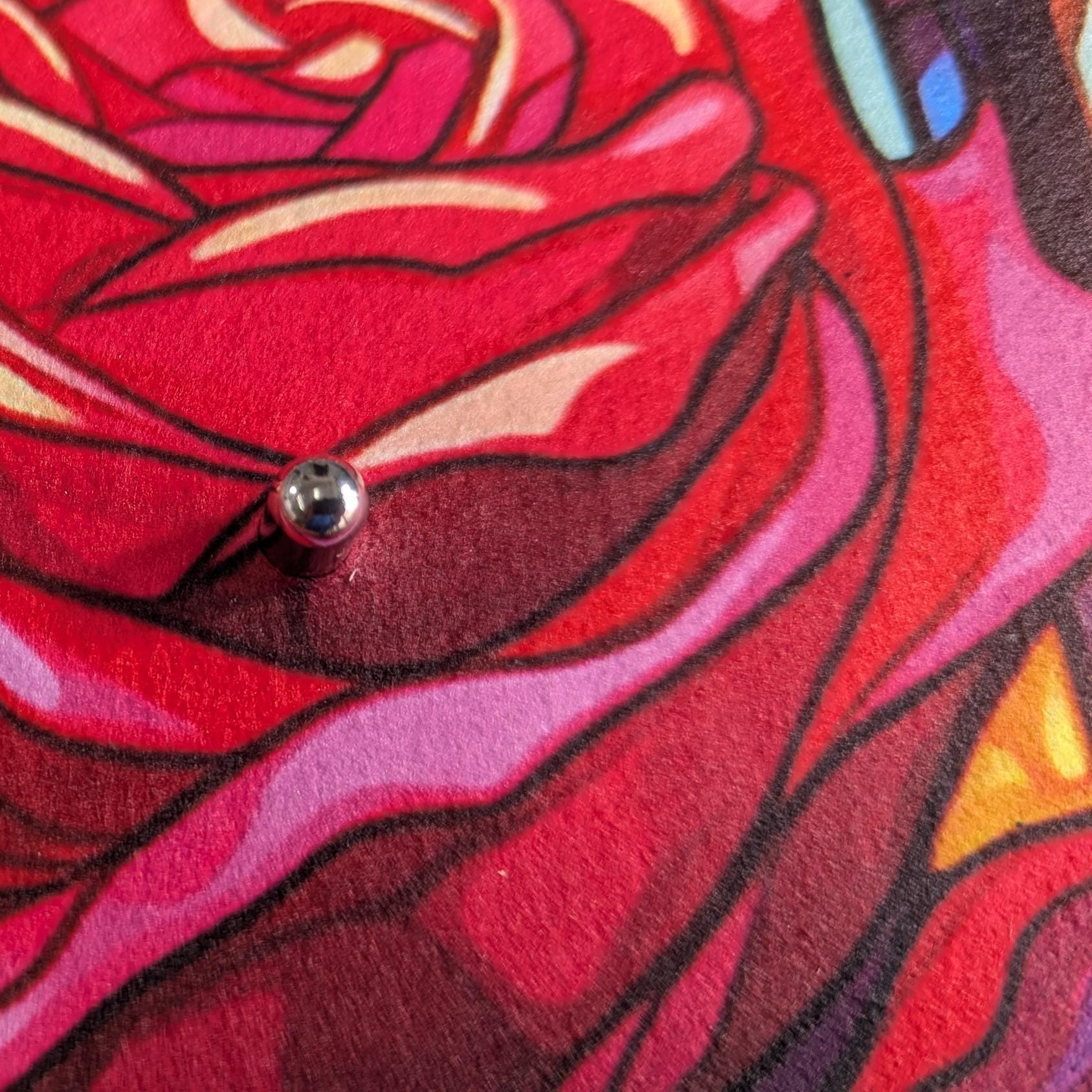 A handmade sublimated felt slip mat 12" Diameter. The design is a stained glass-like crystal rose The rose, a timeless and enchanting symbol, embodies grace, beauty, and elegance. Much like this exquisite flower, you possess an undeniable allure and captivating charm that leaves a lasting impression on everyone you encounter. Just as the rose's delicate petals exude a sweet fragrance, your presence fills the air with warmth and positivity, uplifting those around you. Your ability to effortlessly navigate through life's complexities mirrors the rose's thorny stem, displaying resilience and strength in the face of adversity. Like the rose's vibrant hues, your vibrant personality shines brightly, attracting admiration and adoration from others. Your genuine kindness and compassionate nature make you a source of comfort and solace for those in need. Embodying the essence of the rose, you are a true embodiment of beauty and grace, subtly leaving an indelible mark on the hearts of those fortunate enough to cross your path. Using a slip mat on your turntable is essential for preserving the quality of your vinyl records and enhancing your listening experience.